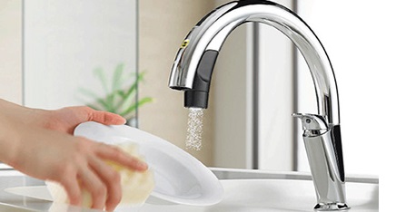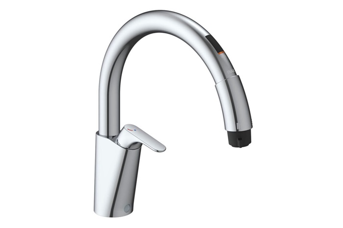 操作は吐水口先端のセンサーに手をかざすだけ。汚れた手でも触れずに楽々操作できます。
