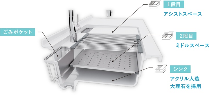 シンクの上だけで「洗う・切る・捨てる」がスムーズに完結する機能を備えた家事効率を追求したシンクです。